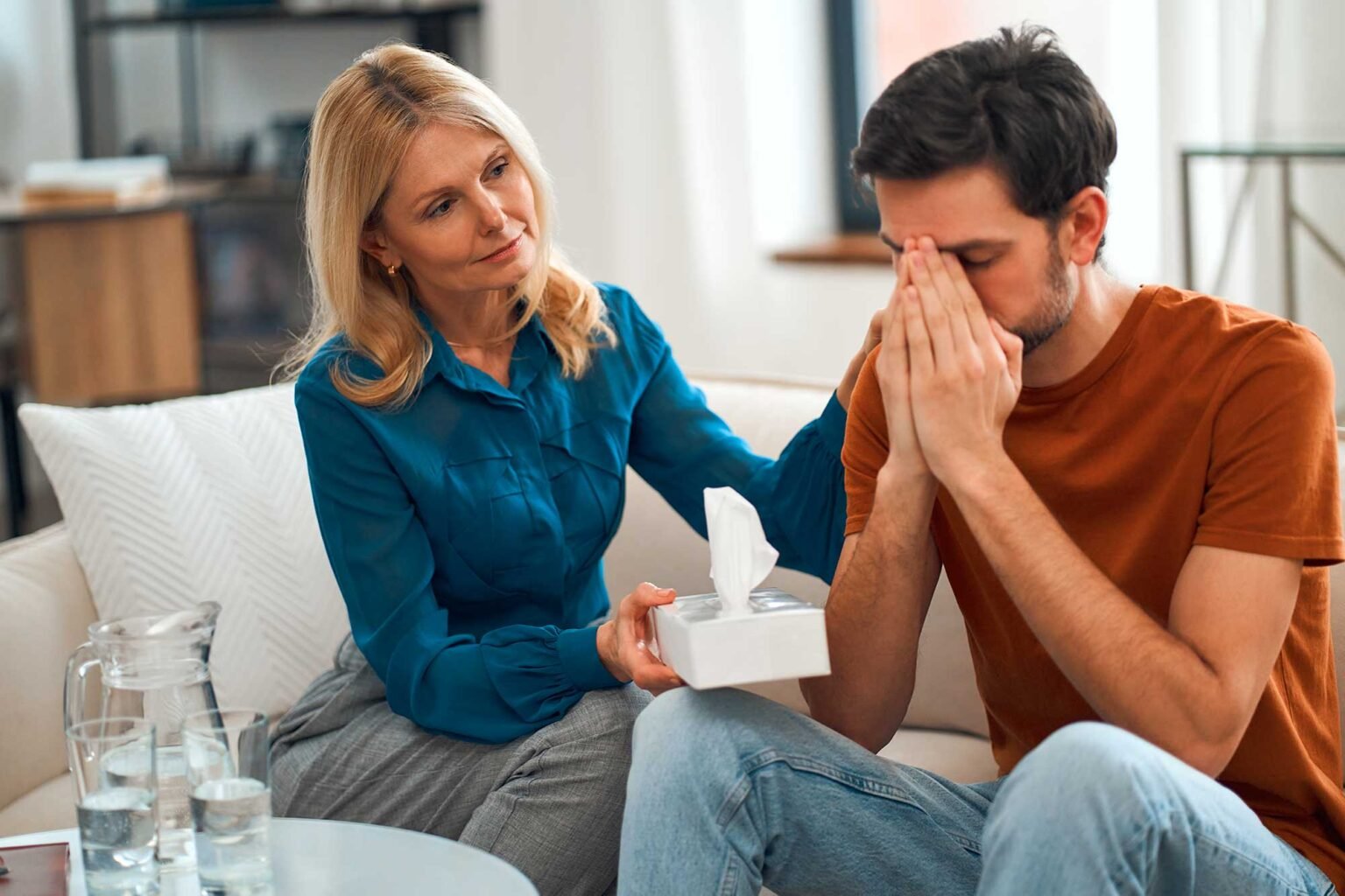 A child with behavioral problems sitting by a table and hitting a teddy bear during a therapeutic meeting with a therapist in a family support center.